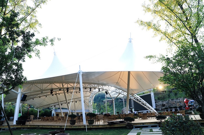 工程概況:梓開元芳草地鄉(xiāng)村月亮場膜結(jié)構(gòu)是由燁興膜結(jié)構(gòu)公司從設(shè)計(jì)、施工、材料等一條龍服務(wù)包干的項(xiàng)目。根據(jù)業(yè)主方要求,項(xiàng)目建成后,在特定時(shí)間將作為大型活動(dòng)的開、閉幕會(huì)場,平時(shí)則作為商業(yè)休閑廣場來運(yùn)行。項(xiàng)目在是在一個(gè)度假景區(qū)的半山腰落地,我們從安全、美觀、實(shí)用性等多方面考慮,它被設(shè)計(jì)成一個(gè)兼具旅游景觀和商業(yè)功用的綜合性膜結(jié)構(gòu)工程。如今工程已經(jīng)竣工并投入運(yùn)行,外觀效果比預(yù)期更美,為度假區(qū)內(nèi)增添了一抹亮色。