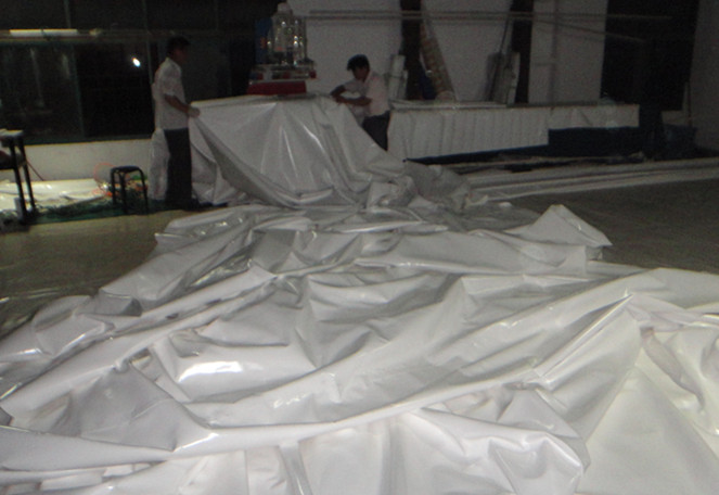 (3)然后,取透明ETFE膜材,按照裂縫形狀,裁剪;由于受熱合機(jī)熱合刀的尺寸限制,我們無法熱合超過熱合刀長度的ETFE膜,因此,按照熱合刀長度,確定角部膜材的尺寸,然后將此膜材整體熱合到撕裂的角部位置。