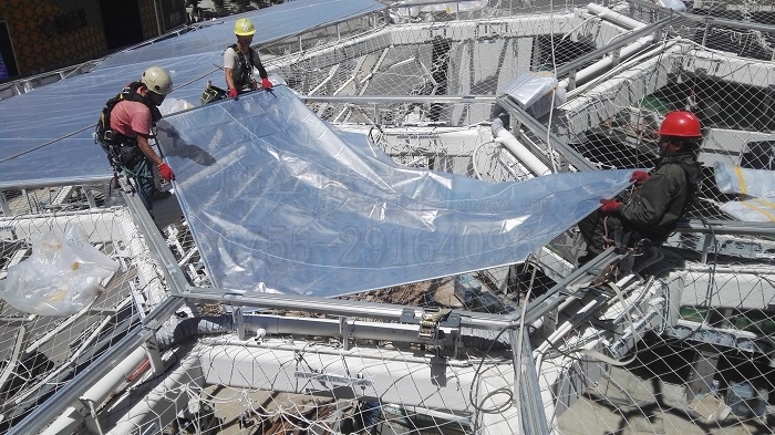 ETFE膜結(jié)構(gòu)工程施工精度要求高,在整體裝膜之前,都要先制作安裝一個(gè)試驗(yàn)單元,以驗(yàn)證現(xiàn)場(chǎng)測(cè)量數(shù)據(jù)指導(dǎo)的膜材加工是否契合實(shí)際需要。如果精確度不夠,需要重新對(duì)數(shù)據(jù)進(jìn)行測(cè)量采集,必要時(shí)還要對(duì)支架進(jìn)行重新制作。只有完全確認(rèn)各項(xiàng)數(shù)據(jù)以后,才會(huì)安排工廠對(duì)其它膜結(jié)構(gòu)單元進(jìn)行加工。