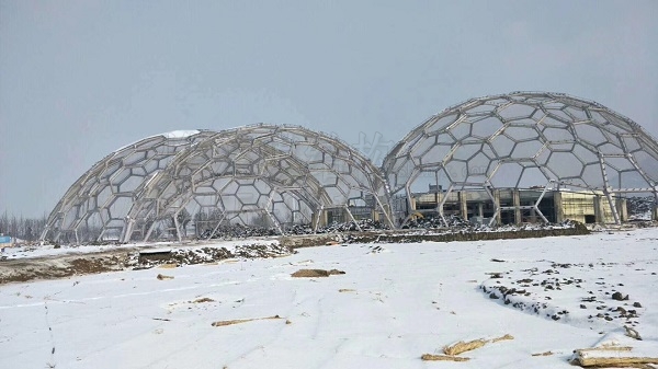 往日里熱鬧的ETFE熱帶植物園項目工地已經(jīng)安靜下來,遠(yuǎn)遠(yuǎn)望去,三個巨大的鋼結(jié)構(gòu)半球靜靜倒扣在冰天雪地中,已經(jīng)開始裝膜的1#球頂部雪白,那是新裝的ETFE膜面攔住了積雪。雖未完工,但已經(jīng)顯露出該有的壯觀宏大氣象。