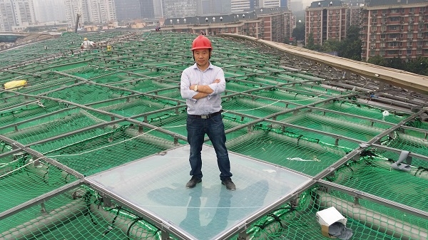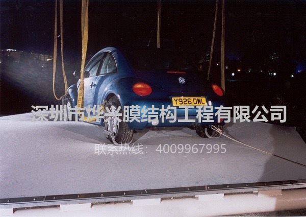 一般建筑用的ETFE膜只有200μm左右,但這薄薄一層透明膜材,其抗壓強(qiáng)度在40MPa以上,具有極強(qiáng)的抗撕裂能力,在不用尖銳物體戳碰的情況下,其物理性能媲美相同厚度規(guī)格的鋼鐵。我們做過(guò)試驗(yàn),在充氣后的ETFE氣枕膜能輕松將汽車托起并且膜材完全不受損壞;在單層膜實(shí)際案例中,沒(méi)有壓邊的情況下膜面也能正常站人(65kg),并且在人離開(kāi)后膜材能完全恢復(fù)。