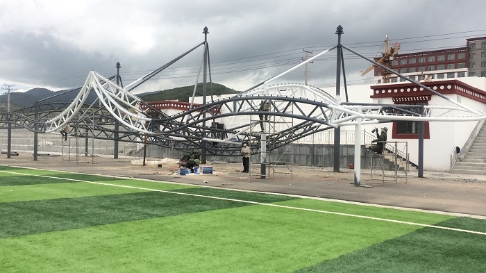 很多人對(duì)燁興膜結(jié)構(gòu)有誤解,認(rèn)為它總部在深圳,所以只承接當(dāng)?shù)丶爸苓叺墓こ蹋@是錯(cuò)誤的。深圳燁興膜結(jié)構(gòu)承接全國(guó)各地及海外的項(xiàng)目工程,并且有能力把工作做好。以甘南體育看臺(tái)工程為例,我們燁興接到工程委托后,根據(jù)工程具體情況組織施工計(jì)劃:鋼結(jié)構(gòu)由我們鋼構(gòu)供應(yīng)庫(kù)中最靠近甘南地區(qū)的標(biāo)準(zhǔn)鋼構(gòu)加工廠進(jìn)行預(yù)加工,然后打包運(yùn)輸?shù)巾?xiàng)目現(xiàn)場(chǎng),膜材同樣如此。在材料準(zhǔn)備妥當(dāng)后,我們會(huì)派遣精干的施工團(tuán)隊(duì)到現(xiàn)場(chǎng)進(jìn)行安裝拼接。