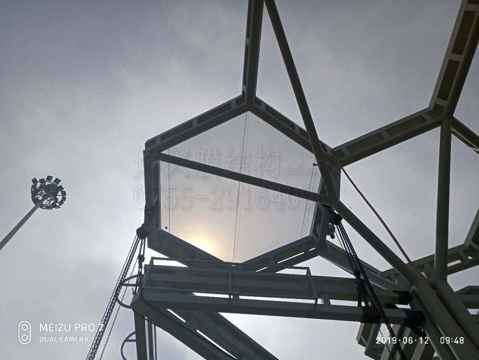 從上圖中我們可以看到,新裝的ETEF氣枕單元成型完美,外觀飽滿無褶皺,從地面往上看通透晶瑩,水泡感滿溢。另外,整個單元與底座高度契合,六角形的六個邊線鋁壓板與外圍邊框間隙邊線都相互平行。這些細節(jié)傳遞出了許多信息,一是我們的鋼結(jié)構(gòu)加工符合工藝標準,二是我們現(xiàn)場的測量人員數(shù)據(jù)收集準確,三是ETFE膜裁剪加工沒有問題,只有全部參數(shù)都符合標準,才能做出這樣完美的ETFE氣枕。