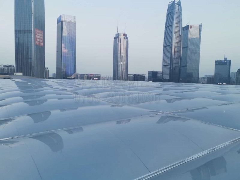 其次從結(jié)構(gòu)形式上分,可將ETFE膜結(jié)構(gòu)歸為兩大類:單層ETFE膜,雙(多)層氣枕膜。它們都需要采用專門的鋁合金支架進(jìn)行支撐固定,并且根據(jù)一定規(guī)律分割成膜單元。單層ETFE膜外觀造型比較簡單,看起來和玻璃相近;雙(多)層氣枕膜需要使用專業(yè)的充氣系統(tǒng)進(jìn)行智能充氣,保持膜氣枕鼓起,從而獲得立體的氣泡美感和良好的保溫隔熱性能。ETFE氣枕膜是目前最新奇炫麗的屋面形式之一,每個(gè)作品都成了吸引客流的城市地標(biāo)。需要注意的是,ETFE氣枕膜屋面,一旦投入使用后,就必須保持充氣設(shè)備運(yùn)行穩(wěn)定,保證氣枕內(nèi)的氣壓在設(shè)計(jì)要求值內(nèi)。