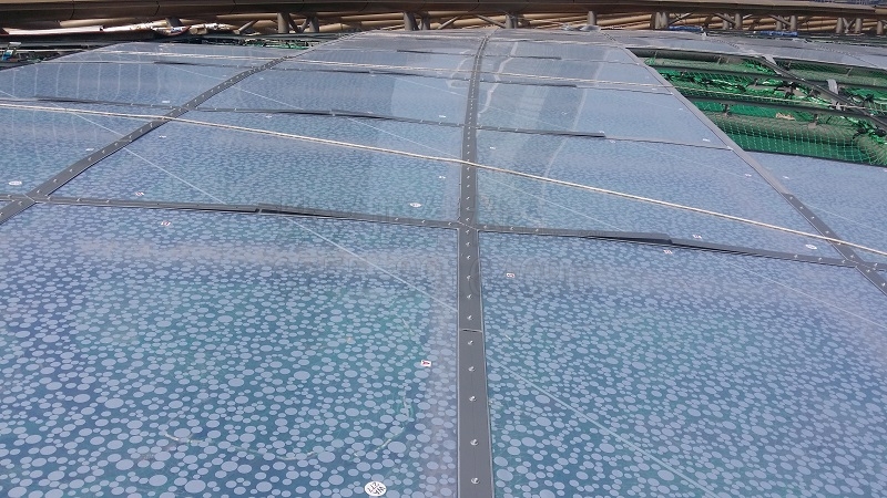 最后是ETFE膜材顏色,常規(guī)的有無色透明、淡藍(lán)、乳白色、透明加花紋鍍點(diǎn)等。膜材顏色方面,一般是根據(jù)項(xiàng)目追求的效果去選用。無色透明、淡藍(lán)、乳白色等,都是純色的,其透光度等性能都比較固定。這里主要說一下使用最廣泛的透明加花紋鍍點(diǎn)膜。在透明膜上增加花紋鍍點(diǎn),目的是調(diào)節(jié)陽光的通過率,使屋面下的光照環(huán)境更舒適宜人。鍍點(diǎn)花紋的形狀、大小、排布間隔等,都是可以定制的,廠家現(xiàn)貨也提供多種常規(guī)選擇。雖然膜材上加了鍍點(diǎn),但是當(dāng)屋面離地面10米以上時(shí),視覺中,鍍點(diǎn)屋面看起來幾乎是透明的。